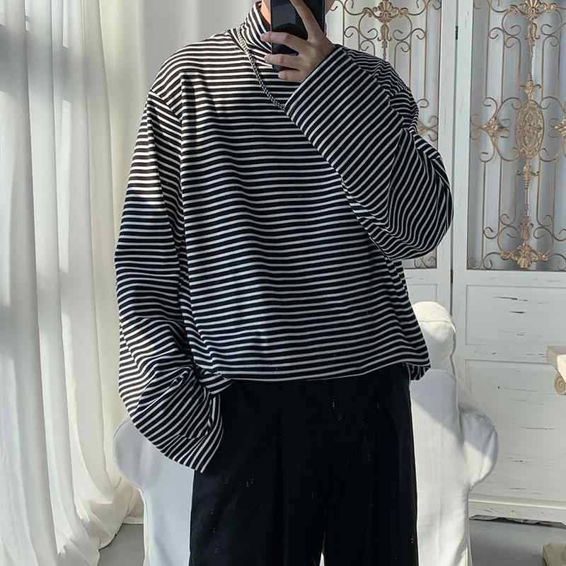 Tシャツ メンズ 男性用 ボーダー柄 ハイネック 長袖 カットソー プルオーバー トップス 普段着 部屋着 秋冬 ポリエステル ブラック ホワイト