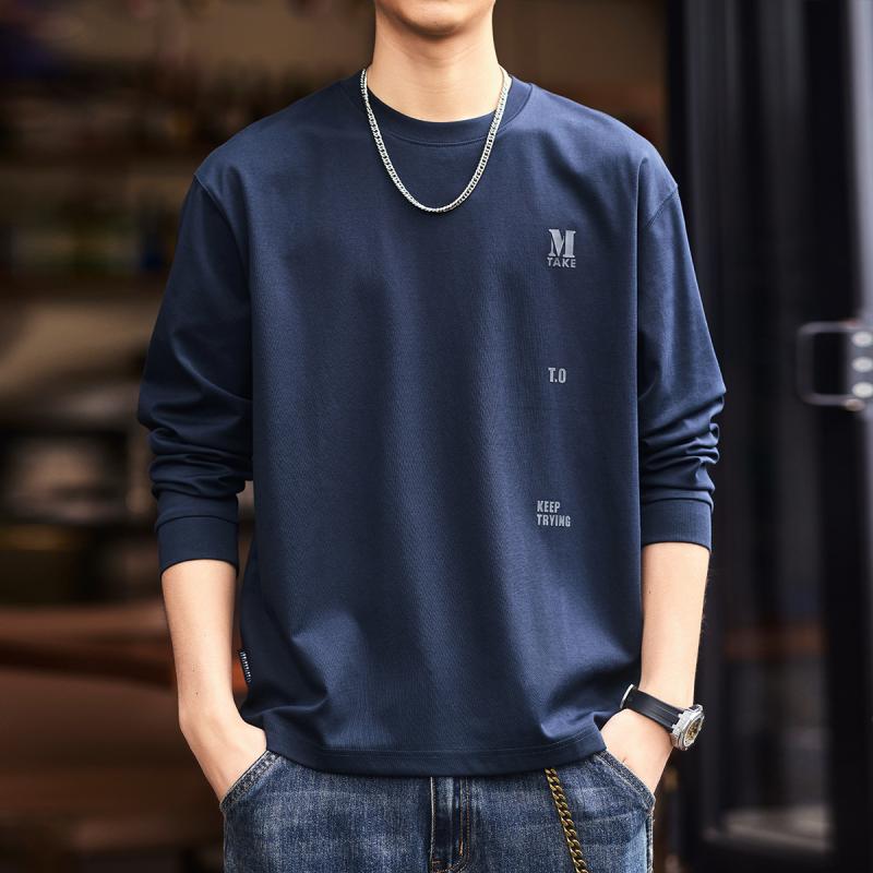 Tシャツ メンズ 男性用 長袖 ルーズフィット ラウンドネック コットン プリント柄 トップス カットソー 宝藍色 カーキ ブラック