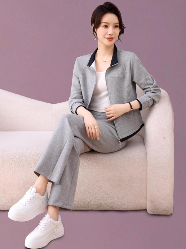 セットアップ レディース 秋冬 スポーツ カジュアル リラックス ジップアップ 長袖 長パンツ ツーピース 綿混 ポリエステル 伸縮性 スタンドカラー