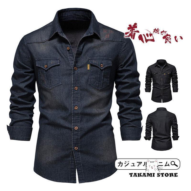 長袖 秋服 ウォッシュ加工 長袖シャツ ミリタリー デニムシャツ トップス カジュ メンズ ワークシャツ スリム ウエスタンシャツ
