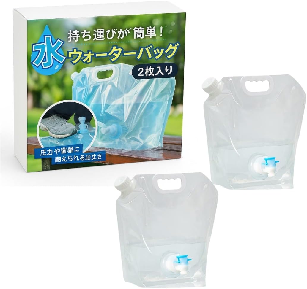 【アウトドアから災害対策まで対応!ウォーターバッグ】水を持ち運んだり蓄えたりでき、地震や断水などの緊急時やアウトドアなど、さまざまなシーンで活躍します。 【安心の耐久性】長期間の使用に耐える優れた耐久性を持ち、摩耗や擦り傷、外部からの衝撃にも強い設計です。災害救助などの厳しい環境でも安心して使用できます。 【持ち運びがしやすい】軽量で、持ち運びがしやすいです。持ち手は厚みのある波形デザインで、しっかり握れるため、運搬時の疲労を軽減できます。 【コンパクトで使いやすい】大容量でありながら、使用しないときはコンパクトに折りたたんで収納できるので、収納時も場所を取らず、便利です。 【サイズ・スペック】「サイズ」:縦=38cm×横=41cm 重量:100g 容量:10L「入り数」・2枚入り・4枚入り【アウトドアから災害対策まで対応!ウォーターバッグ】水を持ち運んだり蓄えたりでき、地震や断水などの緊急時やアウトドアなど、さまざまなシーンで活躍します。 【安心の耐久性】長期間の使用に耐える優れた耐久性を持ち、摩耗や擦り傷、外部からの衝撃にも強い設計です。災害救助などの厳しい環境でも安心して使用できます。 【持ち運びがしやすい】軽量で、持ち運びがしやすいです。持ち手は厚みのある波形デザインで、しっかり握れるため、運搬時の疲労を軽減できます。 【コンパクトで使いやすい】大容量でありながら、使用しないときはコンパクトに折りたたんで収納できるので、収納時も場所を取らず、便利です。 【サイズ・スペック】「サイズ」:縦=38cm×横=41cm 重量:100g 容量:10L「入り数」・2枚入り・4枚入り