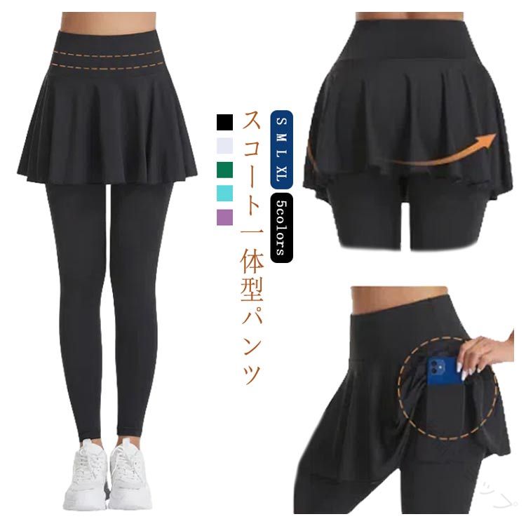 スコート付きパンツ 一体型スコート レディース テニスウェア ゴルフ ヨガ フィットネス UVカット 吸汗速乾 ポケット付き スポーツウェア 体型カバー ランニング パンツ