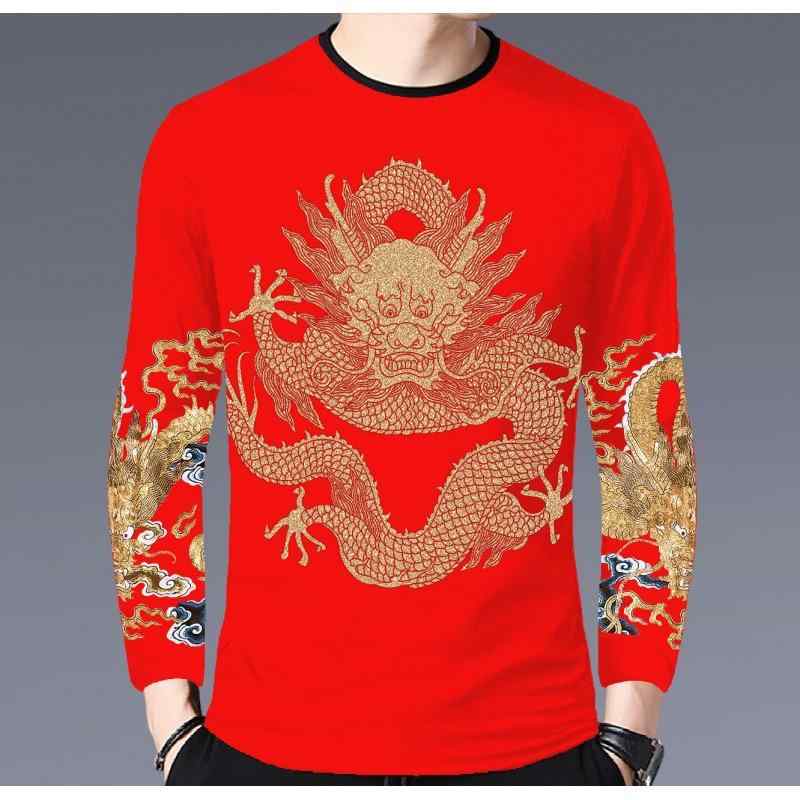 Tシャツ メンズ 男性用 トップス 中国風 ドラゴン 竜 プリント 長袖 薄手 インナーシャツ 接触冷感 秋 スポーティー カジュアル 赤 黒 緑 M L XL 2XL 3XL 4XL