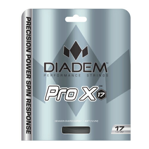 メーカーダイアデム 品名プロ エックス(PRO-X) 品番TFA008 ゲージ1.25mm タイプポリエステル 長さ12.2m カラーシルバー PRO Xは、ダイアデム製品の中で最もパワーがありしっかりとした打球感のストリングです。 現役プロテニスプレーヤーの協力を得て設計されたこのポリストリングは、 6角形の断面構造を持ち、硬めの打感に設計されています。 この硬さから生み出すレスポンスの良さと、エッジの効いた形状からインパクト時にボールに噛みつくことで生み出される減速しないスピン性能を発揮します。