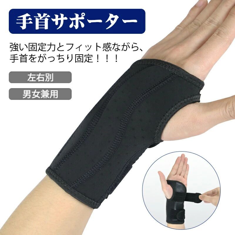 Q :洗濯はどのようにすればよいですか?A :洗濯機、または乾燥機の使用はお避け下さい。ぬるま湯での手洗い後、日の当たらない場所にて乾かしてお使いください。Q :固定強度の調整は可能ですか?A :はい、手首サポーターには脱着式の金属プレートが入っています。外した状態でも使用可能,固定強度を自分好みに調整可能。Q:サイズはどのようになっていますか?A:(右手/左手S/M L/XL)【サイズ選択】右手用左手用S/Mサイズ 手首周り14-19cmL/XLサイズ 手首周り19-23cm手首周りを測り、サイズ表を参考にしてください。Q :左手、右手の区分はありますか?A : “左手用”“右手用”の区分はデザインです。お買い上げの際には、お間違えのないようご確認をお願い致します。商品詳細商品名手首サポーターカラーブラックサイズS〜M:手首回り 14〜19cm L〜XL:手首回り 19〜23cm備考左右別(左右をお選びください) ラップタイプ ラテックスフリー強い固定力とフィット感を両立し、手首をがっちり固定。強い固定力とフィット感を両立。手のひら側と甲側のサンドイッチ構造。 不都合な手首のねじれや、掌屈(しょうくつ)・背屈(はいくつ)の動きを抑制。スポーツ時も、普段の生活の中でも使用可能。手首から手の甲まで全体的に手首をがっちり固定。それでも指は動きます。手根管症候群の方にもおすすめです。高品質素材で手首を保護手首サポーターは生地の素材にこだわりました。(1)手首への締め付けを自由に調整できる(2)激しいスポーツや頻繁な洗濯をしても長持ちする耐久性。(3)長時間装着してもダルくならない軽い素材。こちらの手首サポーターは、右手用と左手用に分かれています。 お買い上げの際には、お間違えのないようご確認をお願い致します。サポーターに入っている金属プレートが、あなたの手首に合わせて密着し、患部をしっかりとホールドします。痛みを押さえながらも、最低限の動きはできるので、改善を早められますよこんな手首のお悩みの方におすすめスポーツ時の手首・指の問題に手首のねじれを抑制したい手首掌屈・背屈を抑制したい手首の骨折後のケアに(病院指定の装具を使用後)初期状況日常生活(家事など)での慢性的な手首/指の問題に転んで手をついてしまった(舟状骨骨折・橈骨遠位端骨折など)腱鞘炎・手根管症候群など小指側付け根部分の問題に(TFCC損傷など)使用上の注意事項汚れが気になるときは、ぬるま湯で中性洗剤を使い、手洗いしてください。洗濯機、乾燥機、アイロン、ドライクリーニングのご使用はおやめください。天日干しはお控えください。直射日光に当たると変色・退色する可能性があります。本商品は、手首の支持・ケア用途以外の目的にはご使用にならないでください。湿疹や皮膚炎、傷等がある場合、または万一過剰な刺激を感じた時にはご使用にならないでください。肌に疾患を持つ方・糖尿病・血行障害・化学療法を受けている方はご使用前に専門の医師にご相談ください。関連ワードサポーター 手首 手首サポーター 腱鞘炎サポーター 手首用 手首固定 手首用サポーター リストガード 損傷 装具 手首固定サポーター 手首保護 プロテクター 手根管症候群 ゴルフ用手首サポーター リストラップ tfcc サポーター 手首固定ラップタイプ 制限 抗菌 防臭 通気 蒸れない 痛くない 締め付けない 締め付けず 蒸れず 吸汗 速乾 耐久性 親指 付け根 痛み 小指 側 手 背屈 小指付け根 巻く ダイビングスーツ素材 育児 産後 家事 ゴルフ スポーツ 野球 ボーリング テニス 運動 パソコン スマホ ボクサー 骨折 後 手 根 管 症候群 手首のトラブル スポーツでケガ 障害 リハビリ マタニティ 怪我防止 捻挫 子供 大人 高齢者 お年寄り 女性 レディース おしゃれ メンズ 男性 男女兼用 左右別 20代 30代 40代 50代 黒 ブラック S M L XL ギフト プレゼント 贈りもの 贈り物 誕生日 記念日 新年 クリスマス バレンタインデー 母の日 父の日 シンプル オシャレ おしゃれ ポイント消化 コスパ 安い おすすめ 人気 新品 ポイント消化 送料無料 あす楽