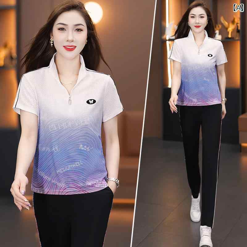 セットアップ レディース カジュアル スポーツウェア 春夏 ファッション おしゃれ 透かし編み 接触冷感 半袖 小柄向け ランニング 吸湿速乾 通気性 軽量 ストレッチ ポリエステル 普段使い おうち時間 30代 40代 50代 スタンドカラー 2点セッ