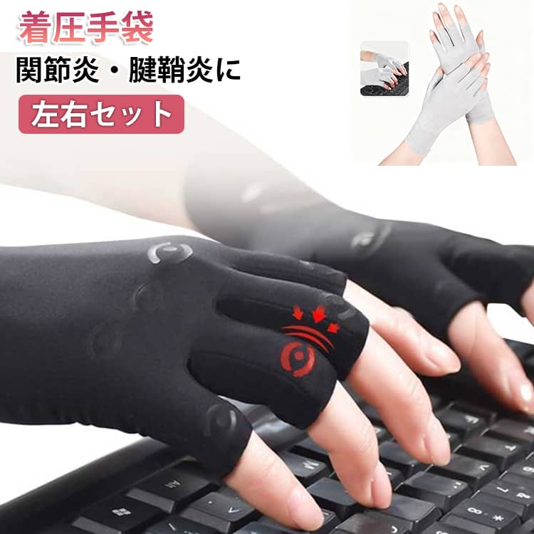 着圧手袋関節炎・腱鞘炎に左右セット【ちょうど良い締め付け感でしっかりサポート】手や手首にかかる負担をやわらげ、日常の動作を快適にサポートする着圧タイプの手袋です。関節炎や腱鞘炎でお悩みの方にもおすすめ!程よい圧力が手全体を包み込み、疲労を軽減します。指先が無いタイプなので、スマホ操作や絵を描くなど細かい作業ももスムーズに行えます。【通気性&弾力性】通気性と弾力性に優れた素材を採用し、長時間の装着でも蒸れにくく快適です。通常のニット手袋に比べて約1.5倍の着圧で、手の疲れを軽減ます。【選べるサイズ】S・M・Lの3サイズ展開で、手の大きさに合わせて選べます。左右セットなので、すぐに両手で使用可能。男女を問わずご利用いただけます。【様々なシーンに】スマホ操作、タイピング、マウス操作、イラスト制作などの日常作業はもちろん、自転車や車の運転時にも活躍。オフィスでも自宅でも使える便利なサポートアイテムです。 サイズ S M L サイズについての説明 【S】手のひら周り17-18cm【M】手のひら周り18-29cm【L】手のひら周り19.5-21cm※サイズ計測には誤差が生じます。 素材 ナイロン ポリウレタン シリコン 色 ブラック グレー 備考 ●サイズ詳細等の測り方はスタッフ間で統一、徹底はしておりますが、実寸は商品によって若干の誤差(1cm~3cm )がある場合がございますので、予めご了承ください。 ●製造ロットにより、細部形状の違いや、同色でも色味に多少の誤差が生じます。 ●パッケージは改良のため予告なく仕様を変更する場合があります。 ▼商品の色は、撮影時の光や、お客様のモニターの色具合などにより、実際の商品と異なる場合がございます。あらかじめ、ご了承ください。 ▼生地の特性上、やや匂いが強く感じられるものもございます。数日のご使用や陰干しなどで気になる匂いはほとんど感じられなくなります。 ▼同じ商品でも生産時期により形やサイズ、カラーに多少の誤差が生じる場合もございます。 ▼他店舗でも在庫を共有して販売をしている為、受注後欠品となる場合もございます。予め、ご了承お願い申し上げます。 ▼出荷前に全て検品を行っておりますが、万が一商品に不具合があった場合は、お問い合わせフォームまたはメールよりご連絡頂けます様お願い申し上げます。速やかに対応致しますのでご安心ください。