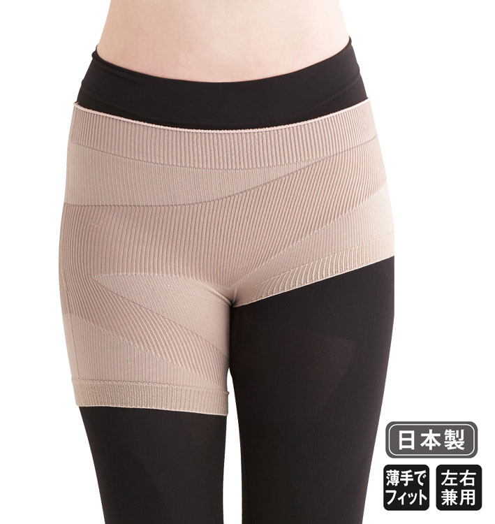 メール便での配達ですので一読ください。 国産の無縫製股関節サポーター。股関節部分を中心に腰回り、足回りにテーピングラインがデザインされた股関節サポーター。がっちりと股関節まわりをサポートするので、立ち上がりも、歩行もらくらく。また機械での編立のみ、無縫製で企画をしているので、履き口部分がとてもゆったりと伸びて締め付けを感じにくい。テーピングラインの引き締め感を実感できます。左右兼用。 ※写真の黒いスパッツは付属しておりません。ベージュ色のサポーターのみのお届けとなります ■材質/ポリエステル、ナイロン、ポリウレタン ■適応サイズ/S~M:ウエスト58〜70cm L〜LL:ウエスト69〜85cm ■日本製